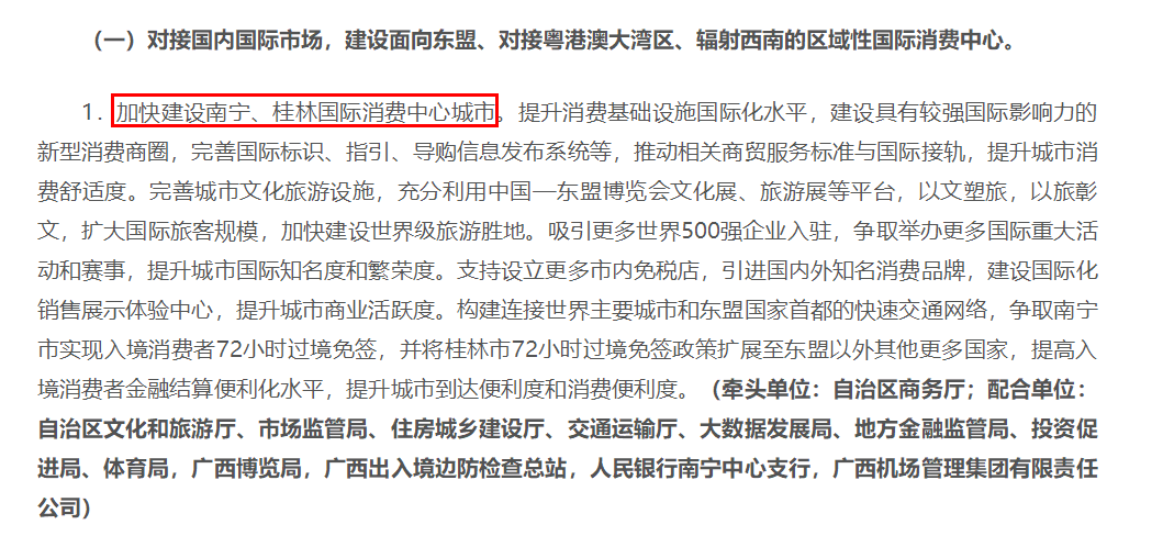近日,自治區政府辦公廳印發《廣西打造國內國際雙循環重要節點樞紐行動方案》中提出工作任務:加快建設南寧、桂林國際消費中心城市,建立完善廣西直供粵港澳大灣區、長江經濟帶的供應鏈。